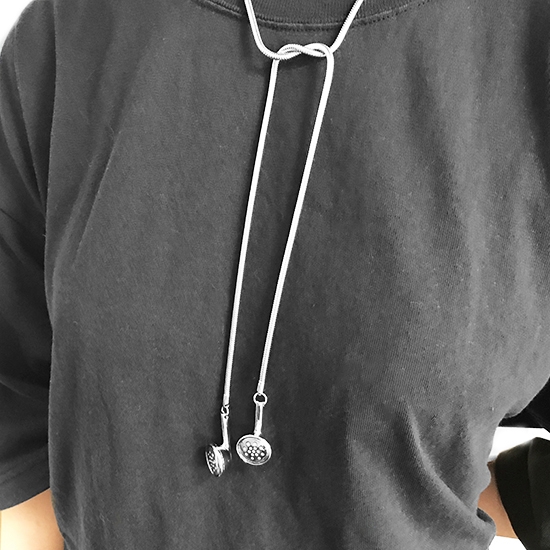 鍊繩使用柔軟度高的蛇鍊,可自由纏繞打結,根據衣領設計自行變化出各種佩戴方式。