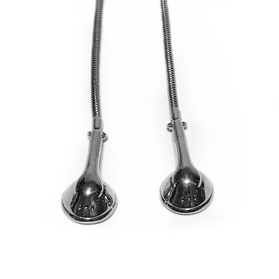 This is a necklace with earphone shaped pendants. It is made of snake chain so that you can wear the necklace as you like. No worry about metal allergy since It is made of stainless steel.