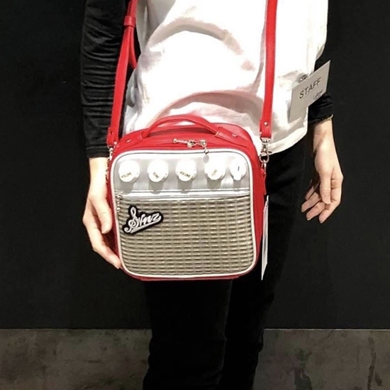 Guitar amplifier shaped vanity bag. a strap drop makes it a shoulder bag. It comes with mirror inside and a movable compartment. It has cute details like guitar knobs.