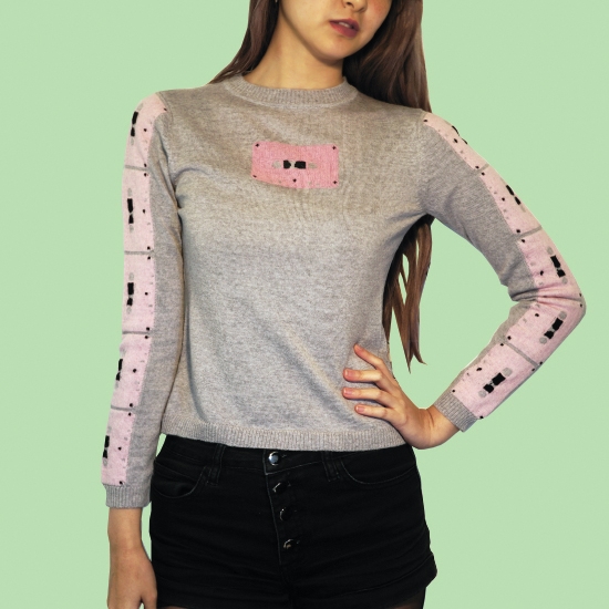 フロントのカセットテープはなんと!手刺繍のクロスステッチのクロスステッチ、袖のカセットテープはインターシャの機械編みです。