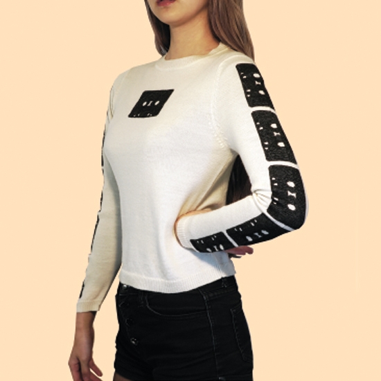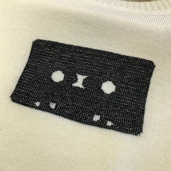SINZのニットウェアのデザイン基本は「音ノリ」です。懐かしいカセットテープをモチーフにした春物ニットウェアです。