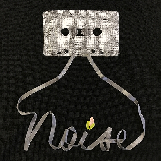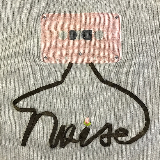 フロントのカセットテープはなんと!手刺繍のクロスステッチ、テープからはみ出て「noise」の文字を描くリボンも丁寧にボディに縫い付けてあります。