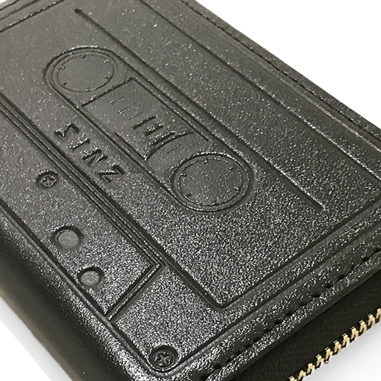 日本製の皮革に、カセットテープの絵柄をエンボス加工を施し立体感を出しました。