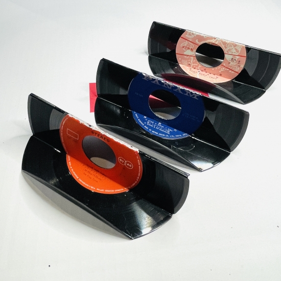 実はレコード板も同じ塩化ビニールなんです! だけど捨てて燃やさなければイイ訳でこんな風に曲げてスマホスタンドやメガネ置き、カードスタンドにして第2の利用価値を考えておきました♡