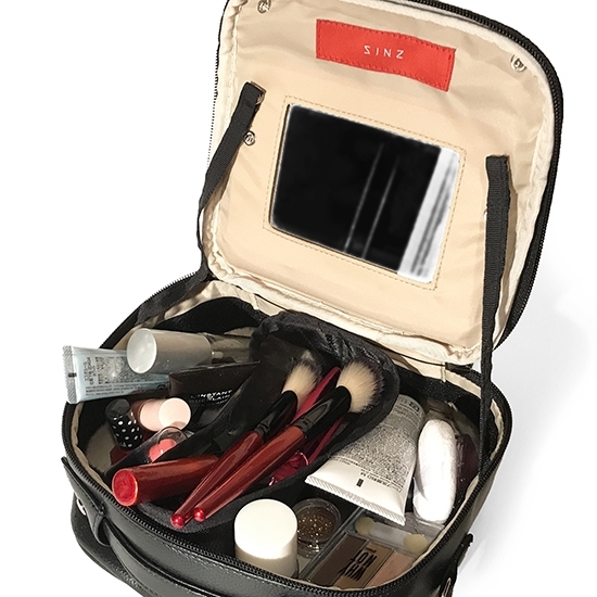 附設的化妝鏡可保持站立,包內空間隔板為魔鬼氈設計,可自由調整分隔收納空間。吉他音量旋鈕的裝飾設計則是達到了畫龍點睛的效果。