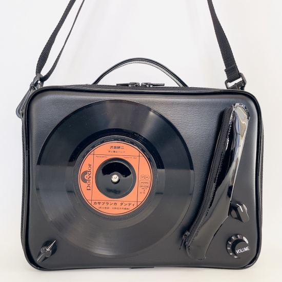 このバッグのポイントは お好きなドーナツ盤のレコードを送って頂ければレコードプレーヤー型のバッグにして 世界でたった一つの貴方だけのオリジナルをお創りできるというセミオーダーの企画です。コレこそ日本で作っているからこそ出来る細かい対応なのです!貴方の大好きなミュージシャンのドーナツ盤はNetや中古を扱っているレコード屋さんに行って捜してみましょう。画像のような黒いレコードだけでなく絵や写真がプリントされてるピクチャーレコード とか 色のついたカラーレコード、真ん中に貼ってあるラベル(レーベル)も面白いモノがイッパイあります。 貴方の感性をくすぐるレコードアートを楽しんで是非覗いてみて下さい。レコード盤を送って頂いた方は特注料金¥15950にてお受けいたします。