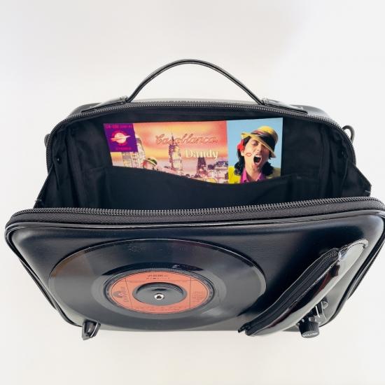 このバッグのポイントは お好きなドーナツ盤のレコードを送って頂ければレコードプレーヤー型のバッグにして 世界でたった一つの貴方だけのオリジナルをお創りできるというセミオーダーの企画です。コレこそ日本で作っているからこそ出来る細かい対応なのです!貴方の大好きなミュージシャンのドーナツ盤はNetや中古を扱っているレコード屋さんに行って捜してみましょう。画像のような黒いレコードだけでなく絵や写真がプリントされてるピクチャーレコード とか 色のついたカラーレコード、真ん中に貼ってあるラベル(レーベル)も面白いモノがイッパイあります。 貴方の感性をくすぐるレコードアートを楽しんで是非覗いてみて下さい。レコード盤を送って頂いた方は特注料金¥15950にてお受けいたします。